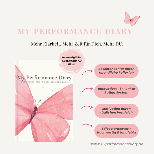 Ich weiß, wie schwer es ist, im Alltag zwischen Arbeit, Familie und eigenen Träumen den Fokus nicht zu verlieren. Genau deshalb habe ich My Performance Diary entwickelt – einen 100-Tage-Begleiter, der dir hilft, Motivation zu finden und deine Erfolge sichtbar zu machen.